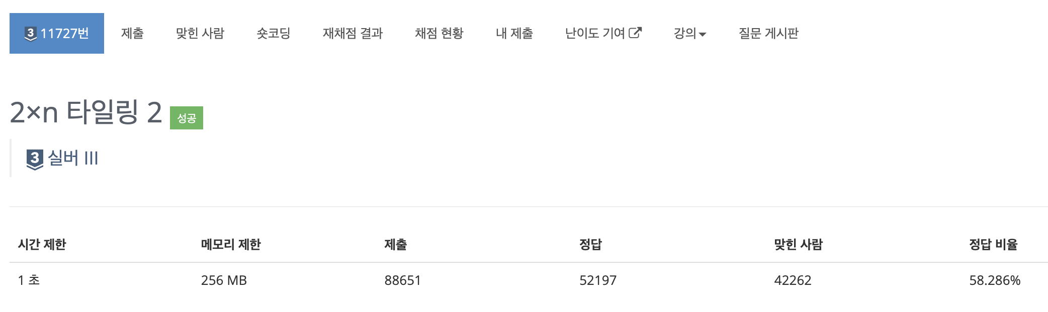 따라서 dp[i] = dp[i - 1] + dp[i - 2] * 2 라고 작성할 수 있다.