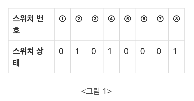 1부터 연속적으로 번호가 붙어있는 스위치들이 있다. 스위치는 켜져 있거나 꺼져있는 상태이다. <그림 1>에 스위치 8개의 상태가 표시되어 있다. ‘1’은 스위치가 켜져 있음을, ‘0’은 꺼져 있음을 나타낸다. 그리고 학생 몇 명을 뽑아서, 학생들에게 1 이상이고 스위치 개수 이하인 자연수를 하나씩 나누어주었다. 학생들은 자신의 성별과 받은 수에 따라 아래와 같은 방식으로 스위치를 조작하게 된다.