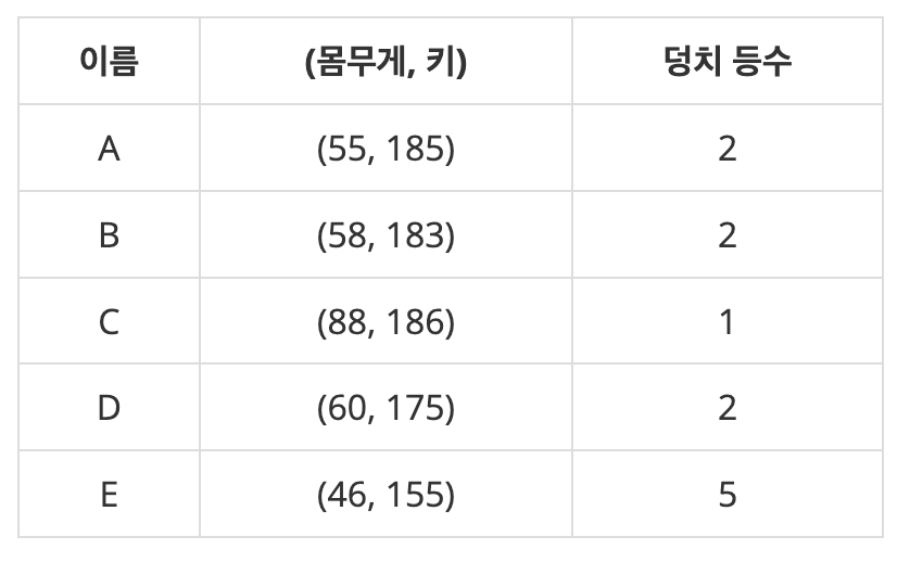 N명의 집단에서 각 사람의 덩치 등수는 자신보다 더 "큰 덩치"의 사람의 수로 정해진다. 만일 자신보다 더 큰 덩치의 사람이 k명이라면 그 사람의 덩치 등수는 k+1이 된다. 이렇게 등수를 결정하면 같은 덩치 등수를 가진 사람은 여러 명도 가능하다. 아래는 5명으로 이루어진 집단에서 각 사람의 덩치와 그 등수가 표시된 표이다.