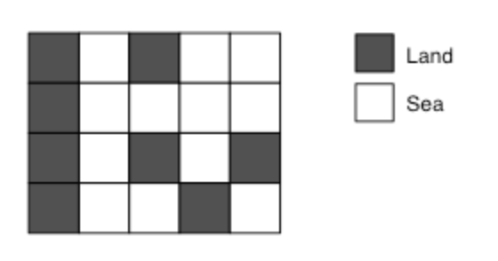 두 정사각형이 같은 섬에 있으려면, 한 정사각형에서 다른 정사각형으로 걸어서 갈 수 있는 경로가 있어야 한다. 지도는 바다로 둘러싸여 있으며, 지도 밖으로 나갈 수 없다.