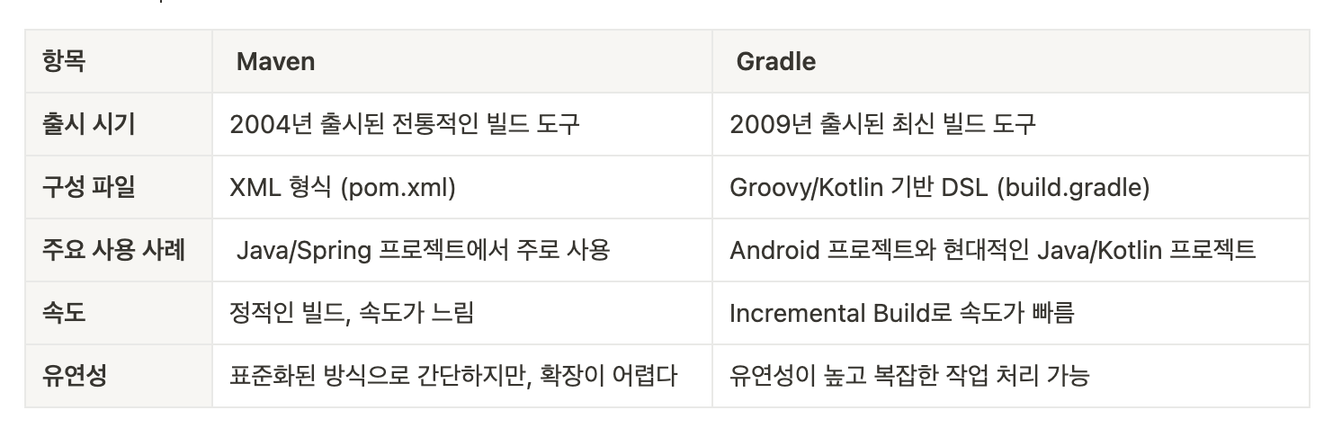 빌드 도구는 프로젝트를 컴파일, 테스트, 의존성 관리, 패키징 같은 작업을 자동으로 처리해주는 도구이다.